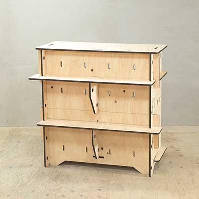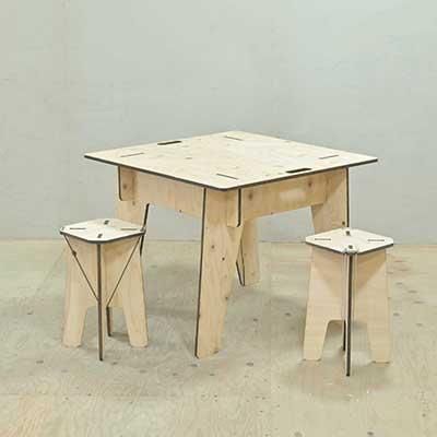 合板をレーザー加工で切断し、組み立て式に仕上げたこのテーブルは、様々なシーンで活躍します。イベントや展示ブース、急なパーティーのお席にピッタリ!さらにキャンプやアウトドアで使うのも便利です。オリジナルペイントで自分だけの特別なテーブルを作成することも可能です。